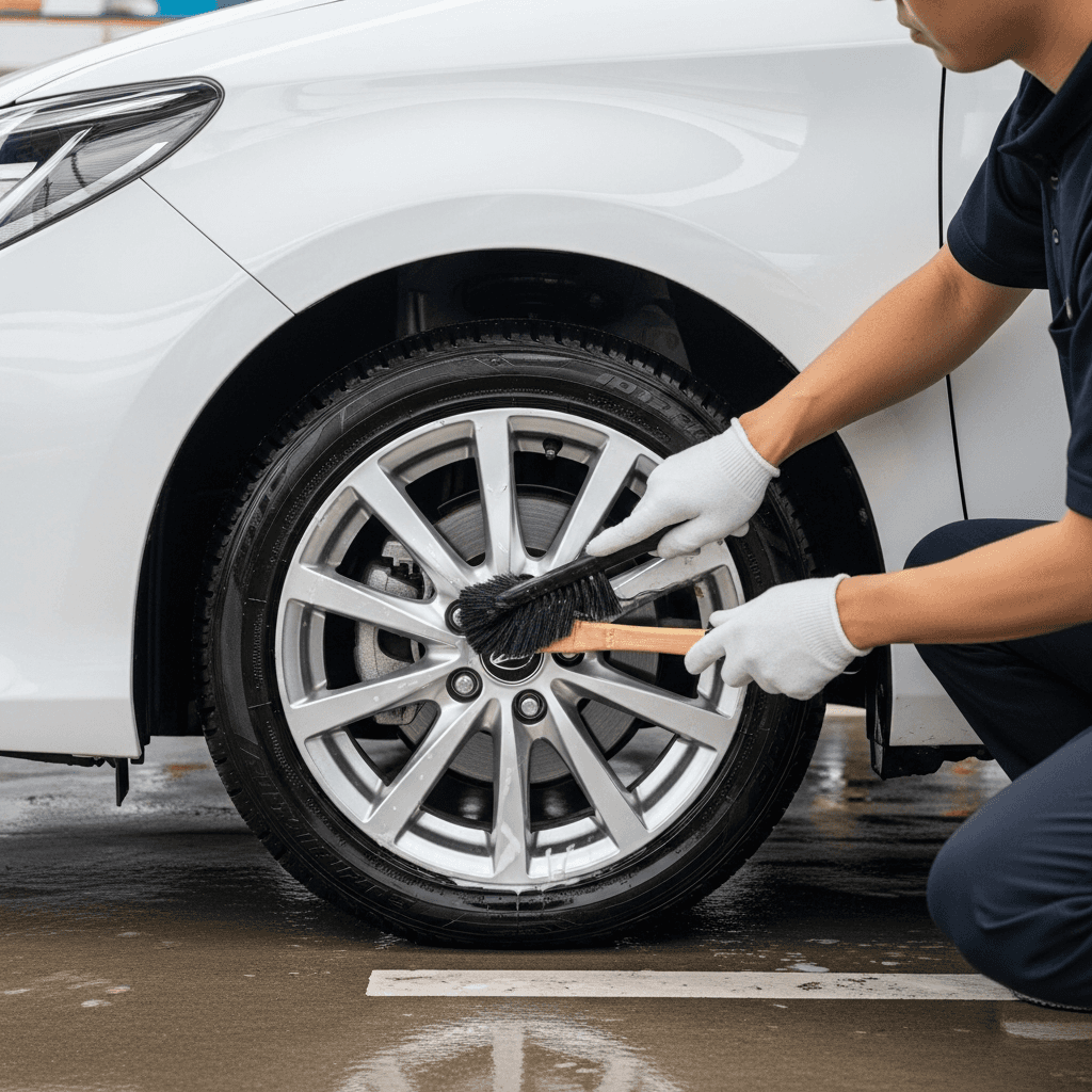 セダンは純正アルミホイールの傷が目立ちやすい。ホイールクリーナーで洗浄+タイヤ溝5mm以上確保で「足回り良好」評価。特にカローラアクシオは高級感が重要で+6~9万円の効果。
