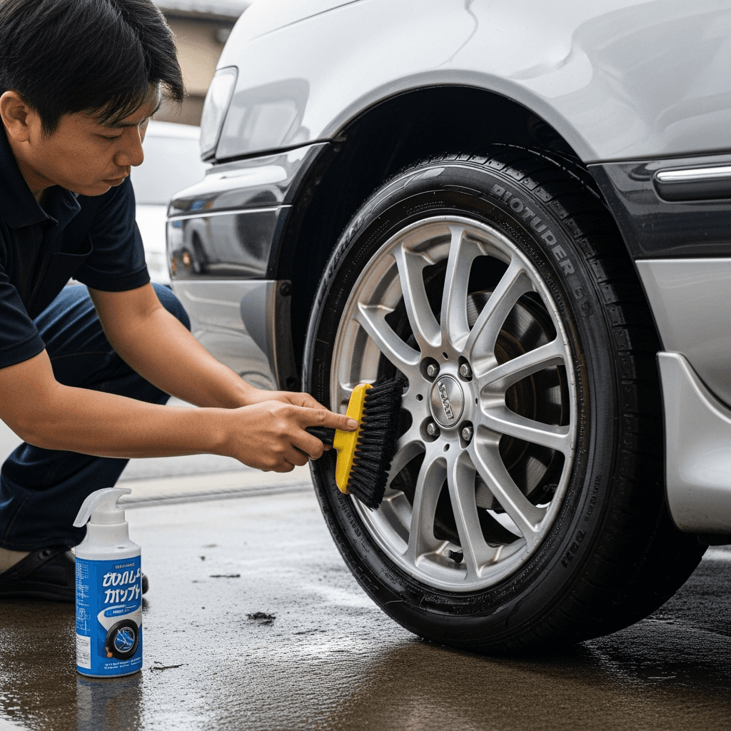セダンは純正アルミホイールの傷が目立ちやすい。ホイールクリーナーで洗浄+タイヤ溝5mm以上確保で「足回り良好」評価。特にカローラセレスは高級感が重要で+6~9万円の効果。