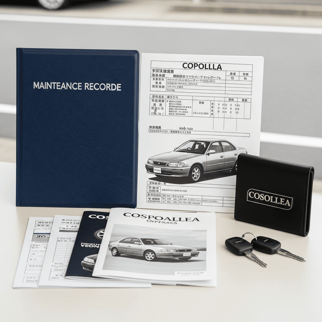カローラセレスは高級セダンとして書類完備が必須。整備記録簿、取扱説明書、スペアキー2本が揃っていれば「ワンオーナー級の管理」で+4~7万円UP。特にスペアキーは重要。