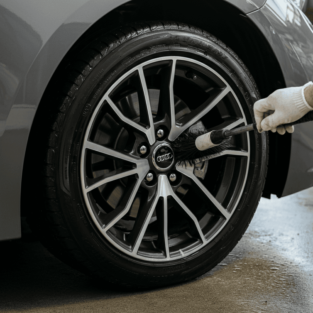 セダンは純正アルミホイールの傷が目立ちやすい。ホイールクリーナーで洗浄+タイヤ溝5mm以上確保で「足回り良好」評価。特にカローラFXは高級感が重要で+6~9万円の効果。