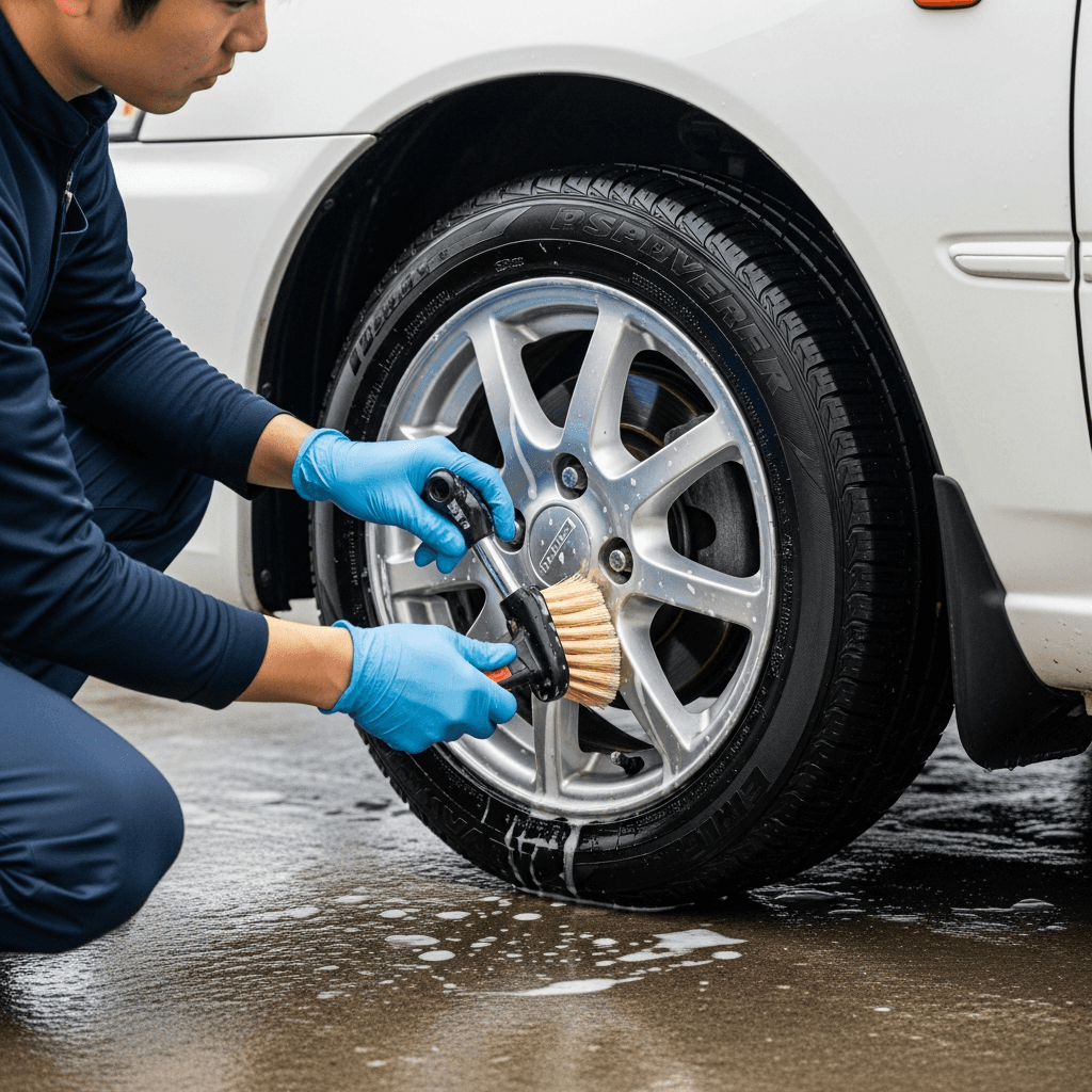 セダンは純正アルミホイールの傷が目立ちやすい。ホイールクリーナーで洗浄+タイヤ溝5mm以上確保で「足回り良好」評価。特にカローラIIは高級感が重要で+6~9万円の効果。