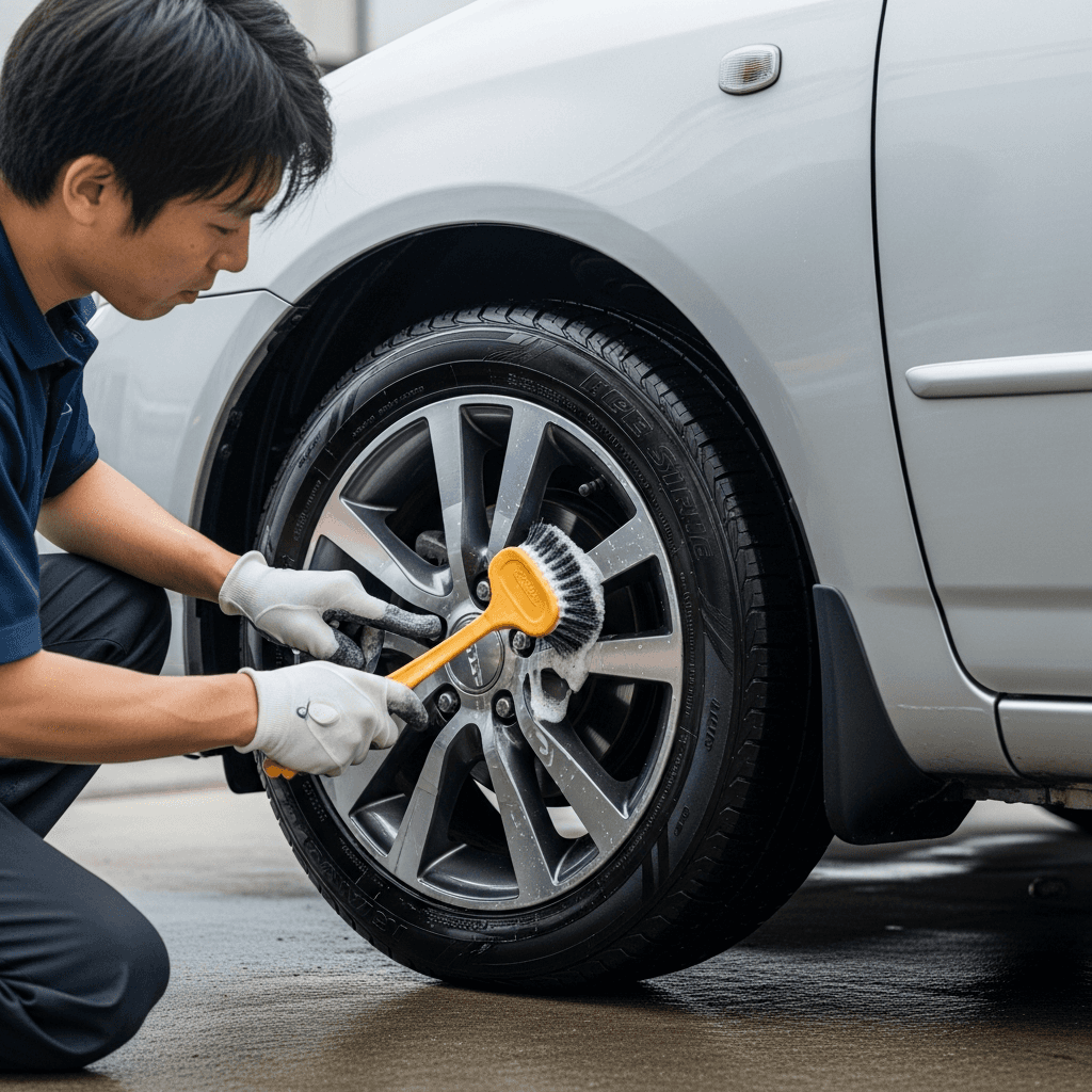 セダンは純正アルミホイールの傷が目立ちやすい。ホイールクリーナーで洗浄+タイヤ溝5mm以上確保で「足回り良好」評価。特にカローラランクスは高級感が重要で+6~9万円の効果。