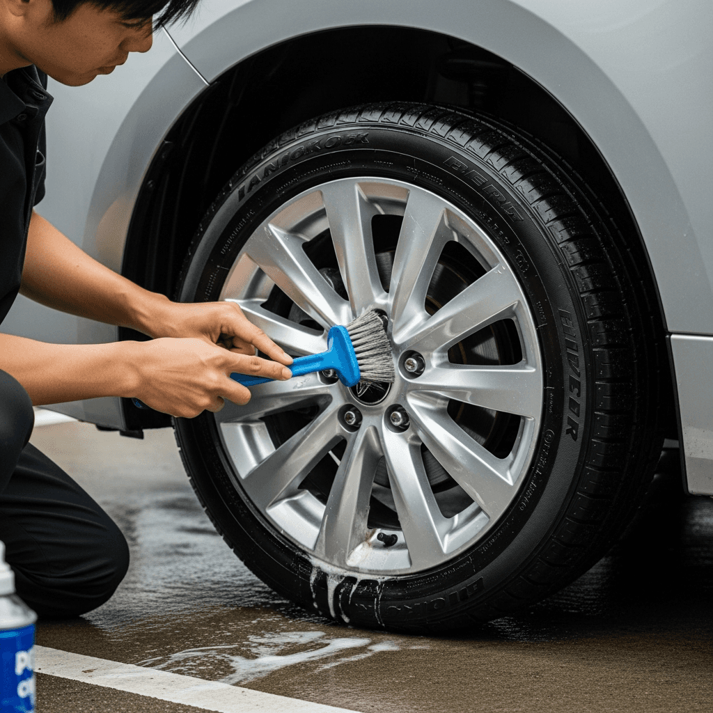 セダンは純正アルミホイールの傷が目立ちやすい。ホイールクリーナーで洗浄+タイヤ溝5mm以上確保で「足回り良好」評価。特にカローラバンは高級感が重要で+6~9万円の効果。