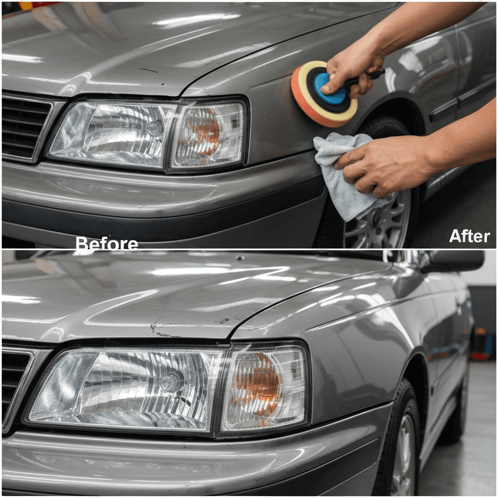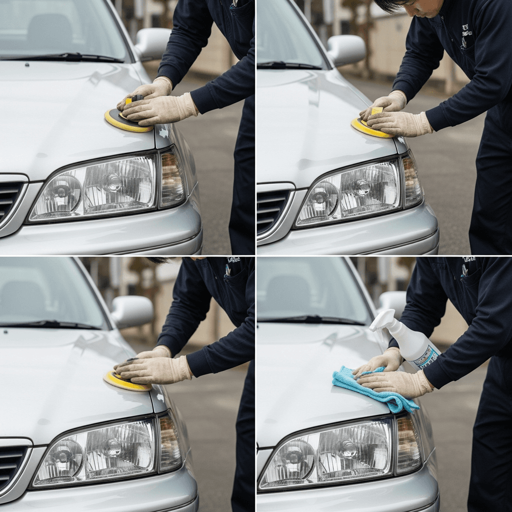 コロナエクシヴはヘッドライトの黄ばみとボディの鉄粉が第一印象を損ねます。研磨+鉄粉除去クリーナー+ワックスで輝きを取り戻せば「程度良好」と判断され+4~7万円の効果。