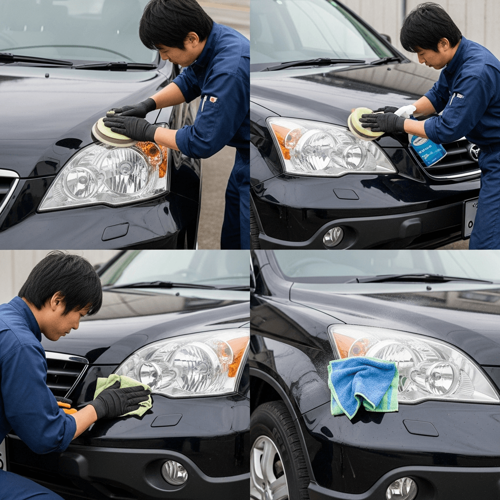 CR-Vはヘッドライトの黄ばみとボディの鉄粉が第一印象を損ねます。研磨+鉄粉除去クリーナー+ワックスで輝きを取り戻せば「程度良好」と判断され+4~7万円の効果。