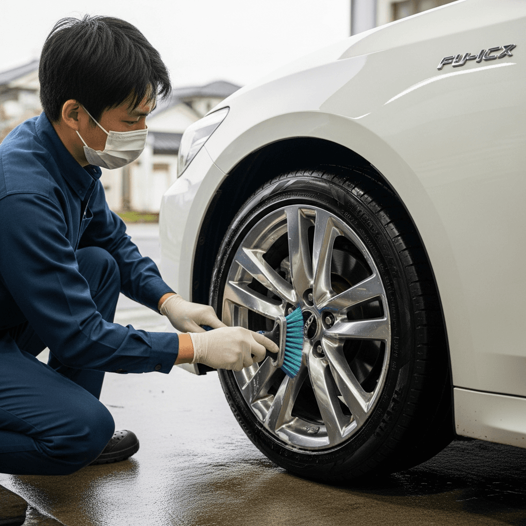 セダンは純正アルミホイールの傷が目立ちやすい。ホイールクリーナーで洗浄+タイヤ溝5mm以上確保で「足回り良好」評価。特にクラウンコンフォートは高級感が重要で+6~9万円の効果。