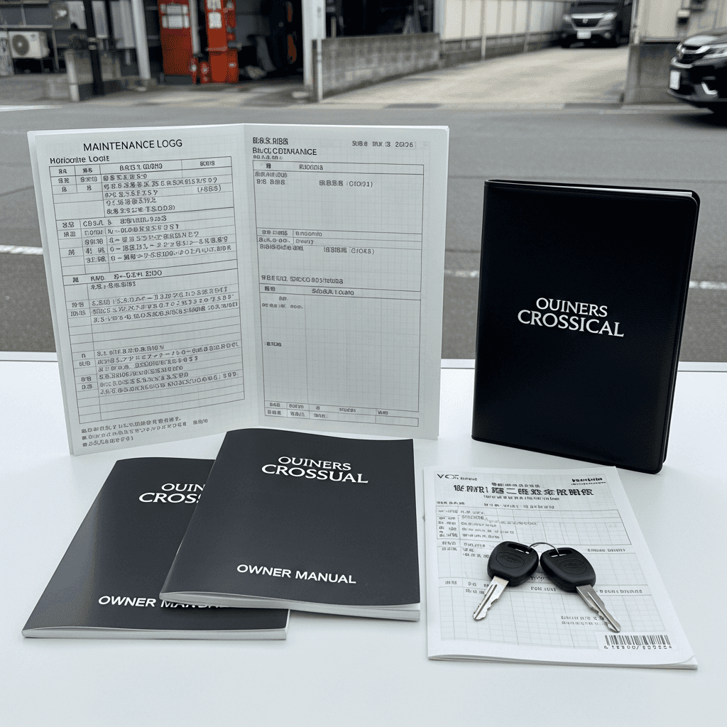 クラウンクロスオーバーは高級セダンとして書類完備が必須。整備記録簿、取扱説明書、スペアキー2本が揃っていれば「ワンオーナー級の管理」で+4~7万円UP。特にスペアキーは重要。