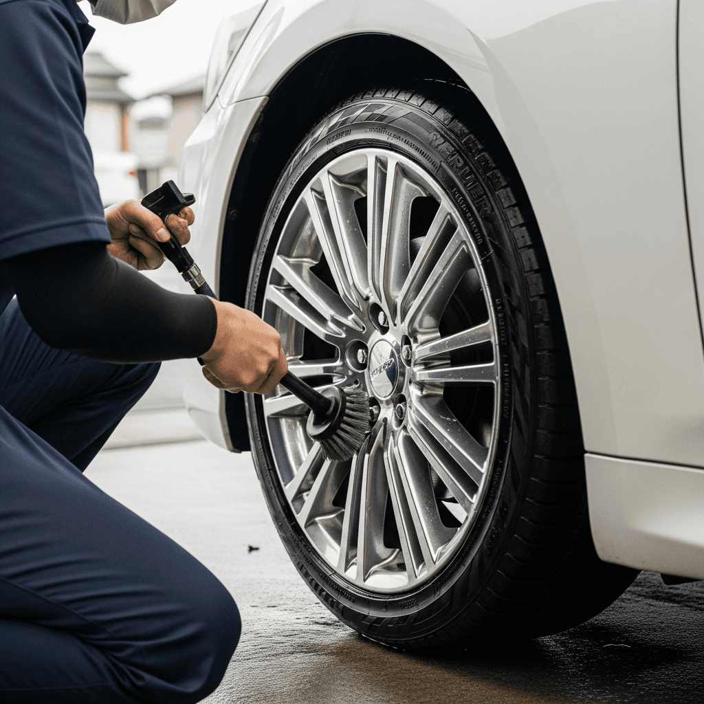 セダンは純正アルミホイールの傷が目立ちやすい。ホイールクリーナーで洗浄+タイヤ溝5mm以上確保で「足回り良好」評価。特にクラウンエステートは高級感が重要で+6~9万円の効果。