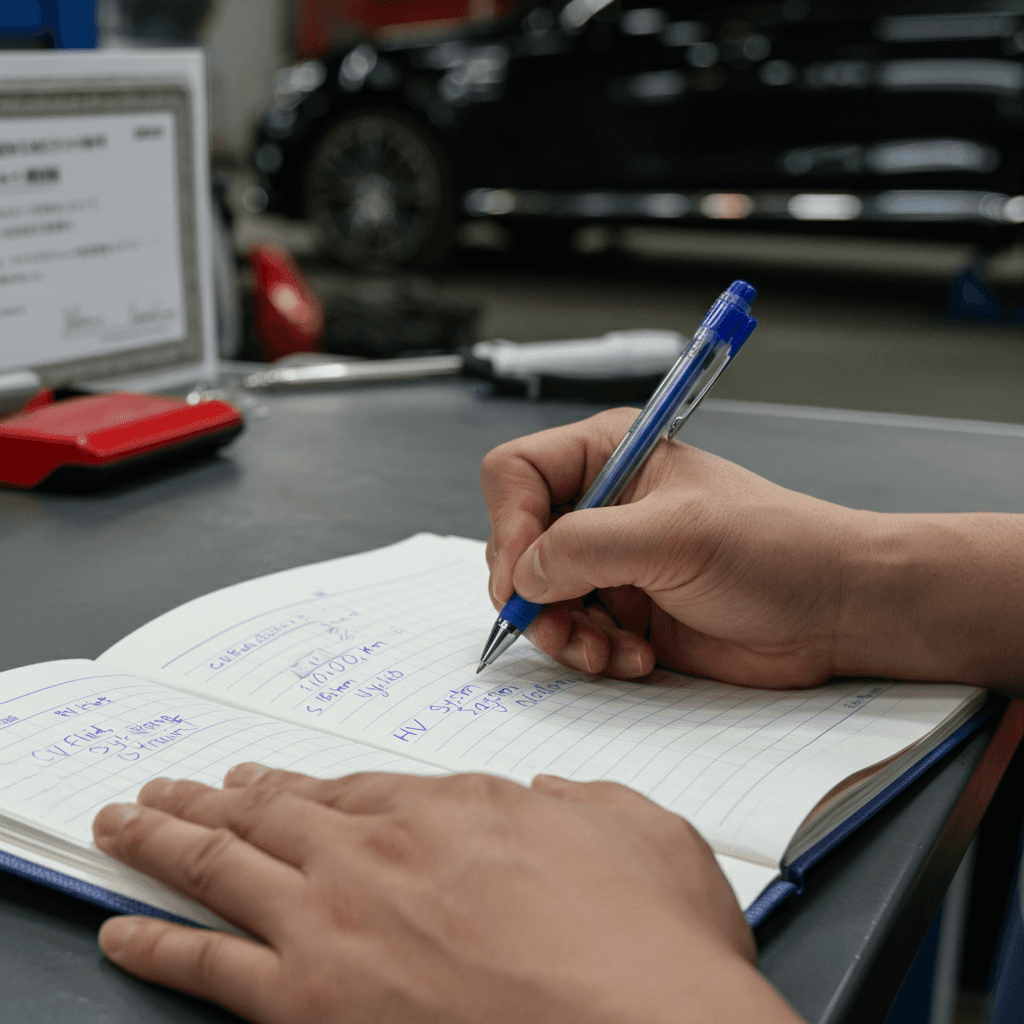 整備記録簿にCVTフルード交換やHVシステム診断の履歴を明記。特に「10万km時CVT交換済」「バッテリー冷却系点検済」の記載があれば査定士の信頼度が急上昇し、+6~10万円の価値創出が可能です。