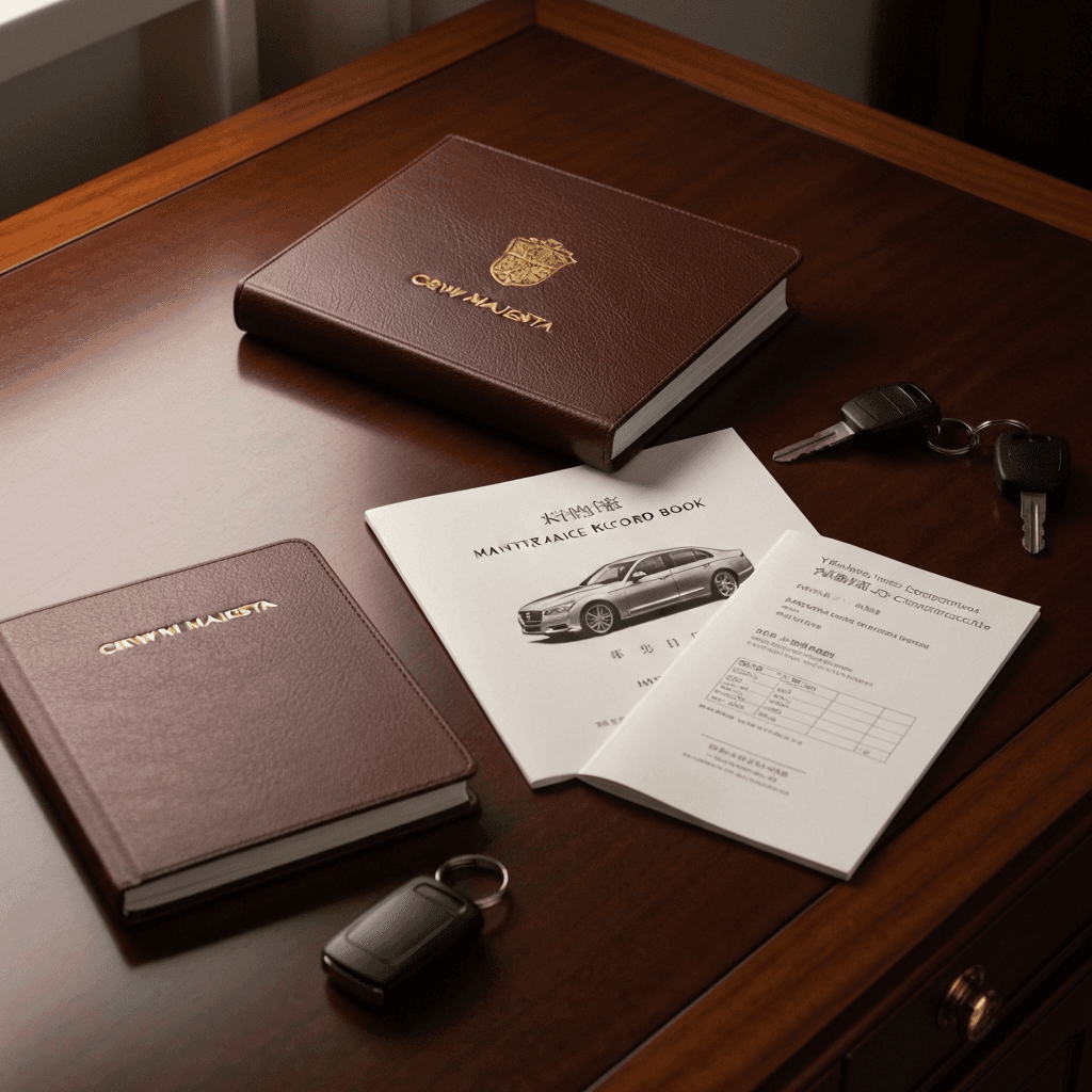 クラウンマジェスタは高級セダンとして書類完備が必須。整備記録簿、取扱説明書、スペアキー2本が揃っていれば「ワンオーナー級の管理」で+4~7万円UP。特にスペアキーは重要。
