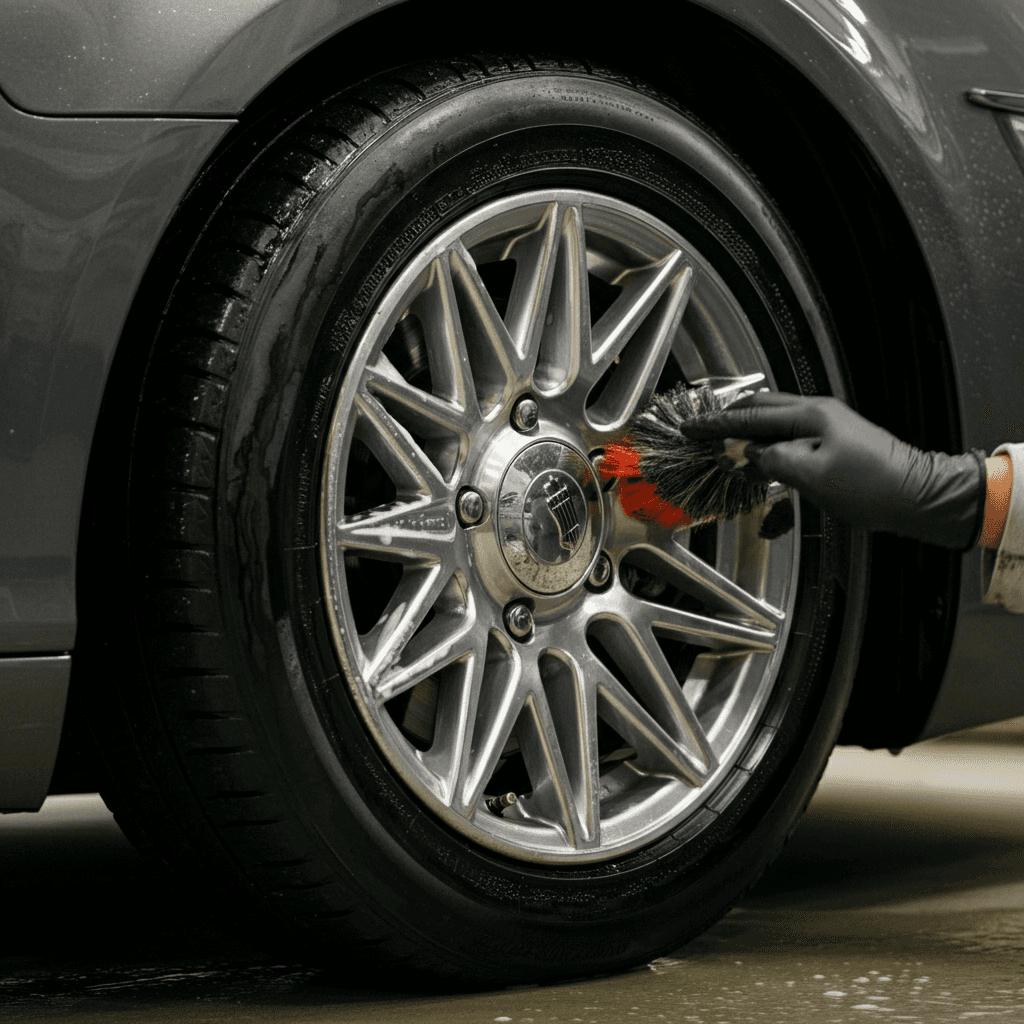 セダンは純正アルミホイールの傷が目立ちやすい。ホイールクリーナーで洗浄+タイヤ溝5mm以上確保で「足回り良好」評価。特にクラウンセダンは高級感が重要で+6~9万円の効果。
