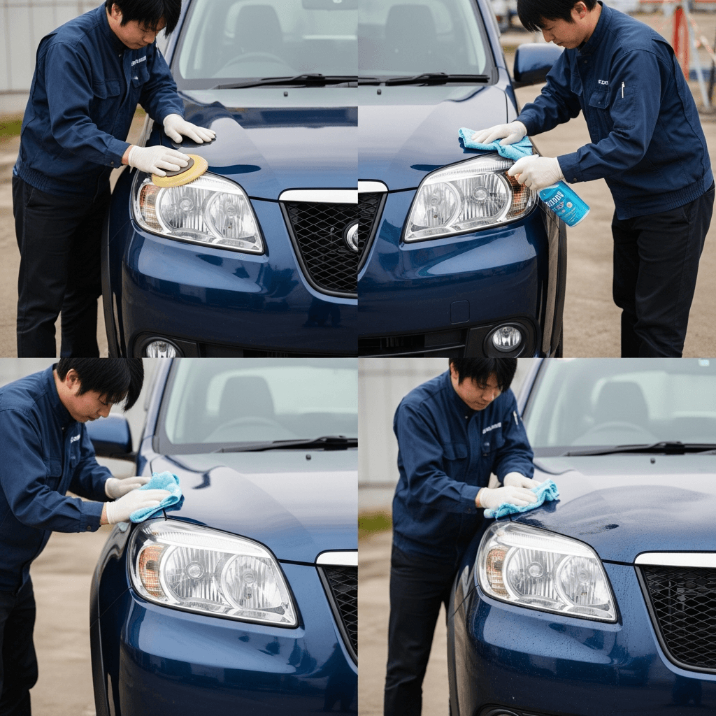 カルタスはヘッドライトの黄ばみとボディの鉄粉が第一印象を損ねます。研磨+鉄粉除去クリーナー+ワックスで輝きを取り戻せば「程度良好」と判断され+4~7万円の効果。