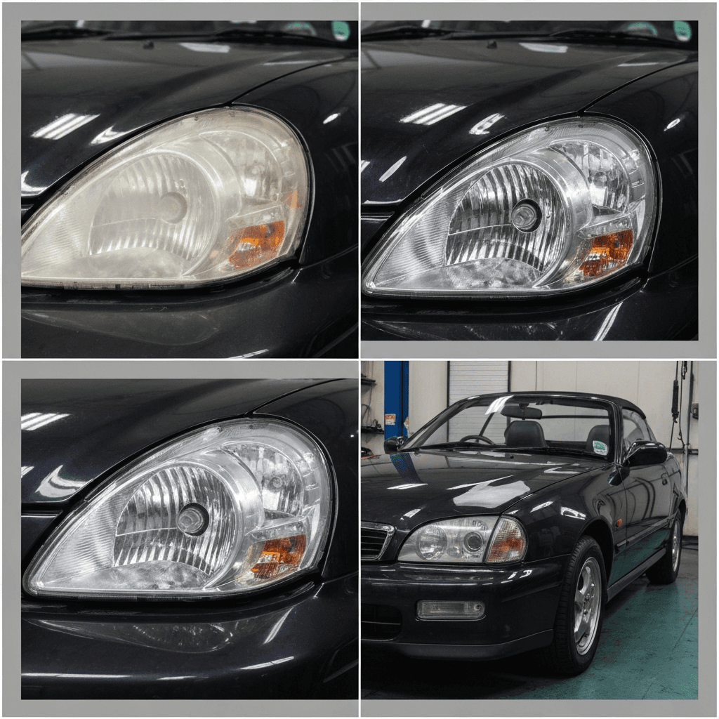 カルタスコンバーチブルはヘッドライトの黄ばみとボディの鉄粉が第一印象を損ねます。研磨+鉄粉除去クリーナー+ワックスで輝きを取り戻せば「程度良好」と判断され+4~7万円の効果。