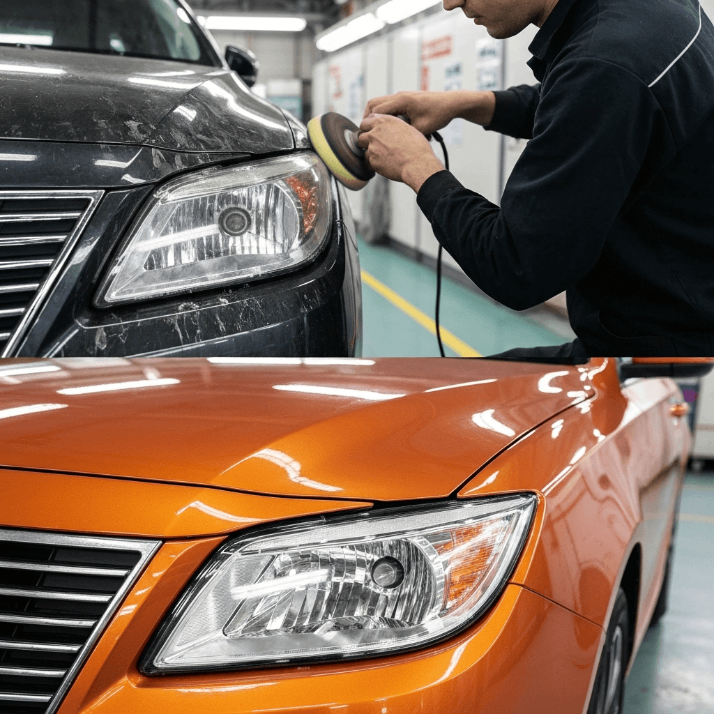 カルタスクレセントはヘッドライトの黄ばみとボディの鉄粉が第一印象を損ねます。研磨+鉄粉除去クリーナー+ワックスで輝きを取り戻せば「程度良好」と判断され+4~7万円の効果。