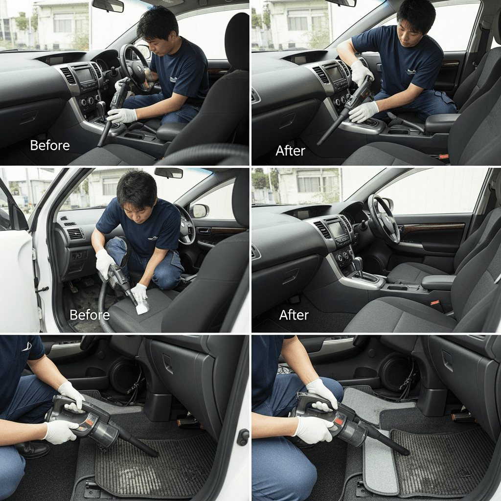 カルタスワゴンは第一印象が査定の8割を決めます。シート隙間のゴミ除去、マット洗浄、樹脂パーツ艶出しで新車級の清潔感に。特に臭いゼロなら「禁煙車」扱いで+5~8万円UP。