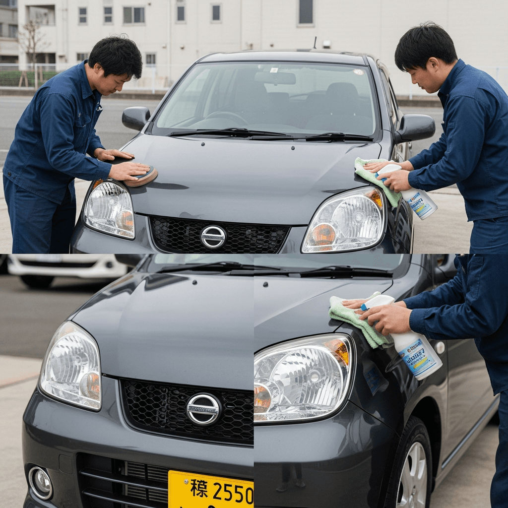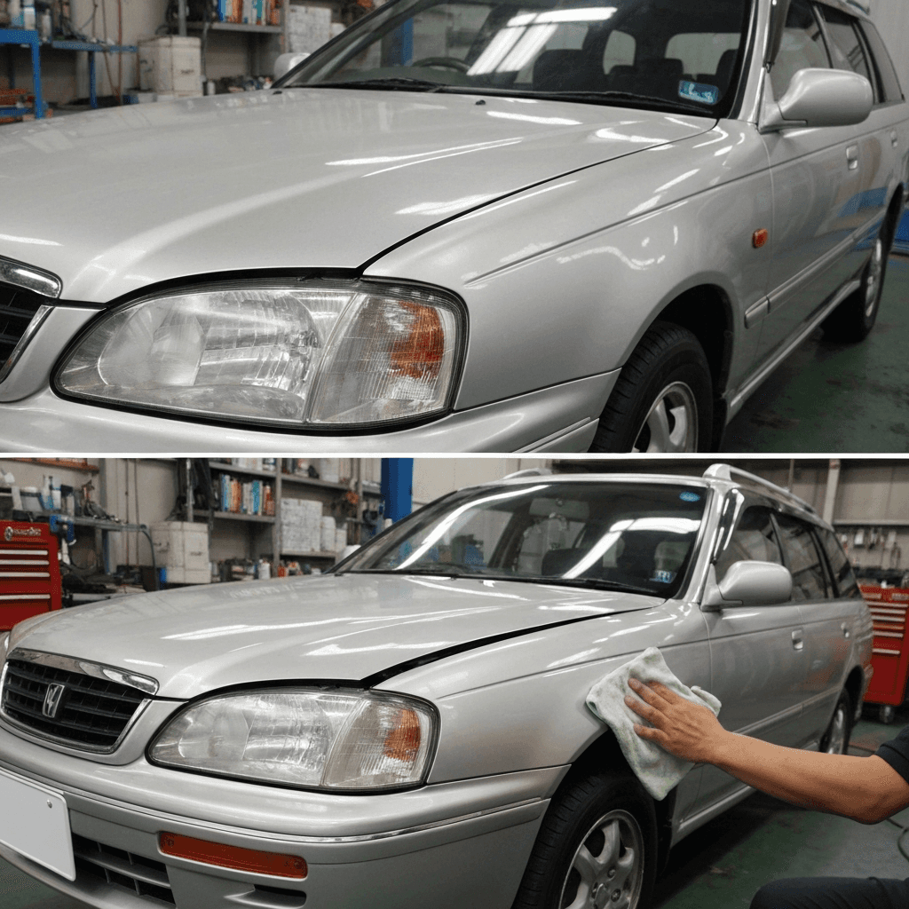 カルタスワゴンはヘッドライトの黄ばみとボディの鉄粉が第一印象を損ねます。研磨+鉄粉除去クリーナー+ワックスで輝きを取り戻せば「程度良好」と判断され+4~7万円の効果。
