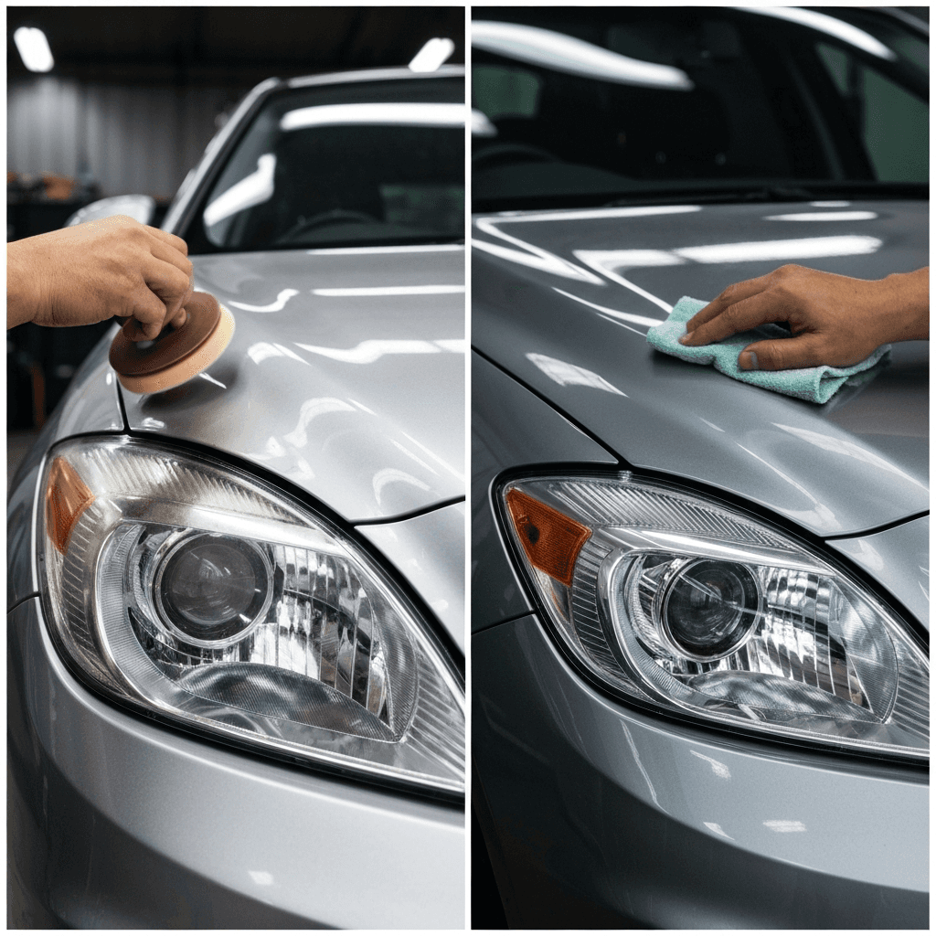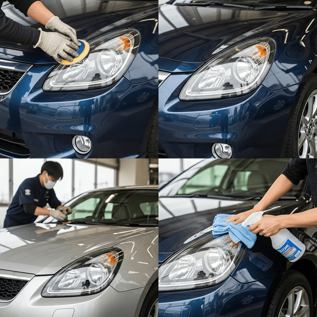カレンはヘッドライトの黄ばみとボディの鉄粉が第一印象を損ねます。研磨+鉄粉除去クリーナー+ワックスで輝きを取り戻せば「程度良好」と判断され+4~7万円の効果。