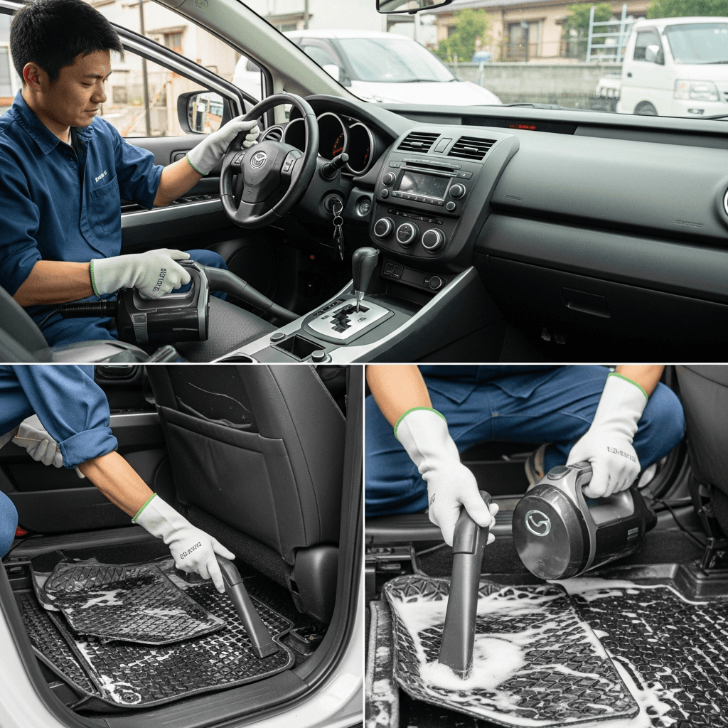CX-7は第一印象が査定の8割を決めます。シート隙間のゴミ除去、マット洗浄、樹脂パーツ艶出しで新車級の清潔感に。特に臭いゼロなら「禁煙車」扱いで+5~8万円UP。