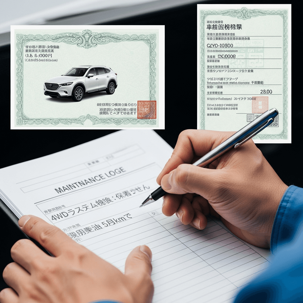 CX-8のようなSUVは4WD性能が価値の源泉。4WDシステム点検とデフオイル交換記録があれば「オフロード性能維持」と高評価され、+8~12万円の査定UPが期待できます。