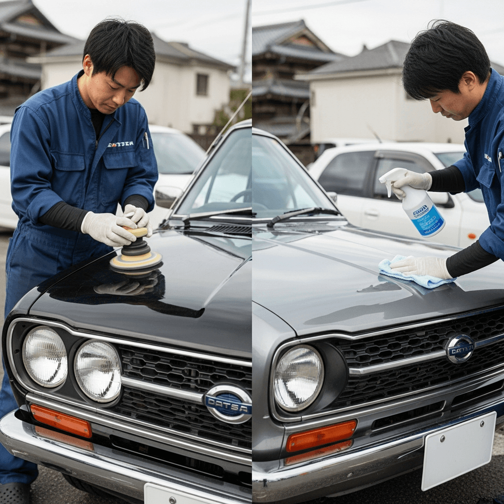 ダットサンはヘッドライトの黄ばみとボディの鉄粉が第一印象を損ねます。研磨+鉄粉除去クリーナー+ワックスで輝きを取り戻せば「程度良好」と判断され+4~7万円の効果。