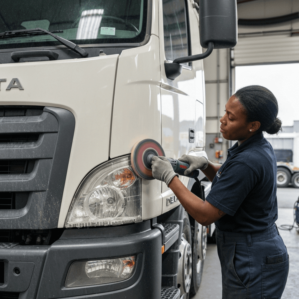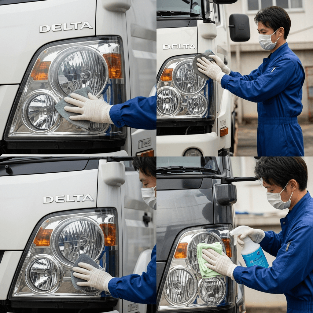 デルタトラックはヘッドライトの黄ばみとボディの鉄粉が第一印象を損ねます。研磨+鉄粉除去クリーナー+ワックスで輝きを取り戻せば「程度良好」と判断され+4~7万円の効果。