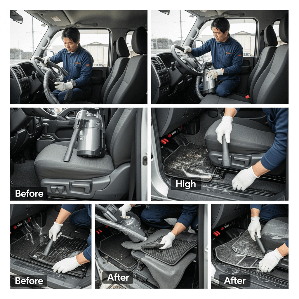 デルタトラックは第一印象が査定の8割を決めます。シート隙間のゴミ除去、マット洗浄、樹脂パーツ艶出しで新車級の清潔感に。特に臭いゼロなら「禁煙車」扱いで+5~8万円UP。