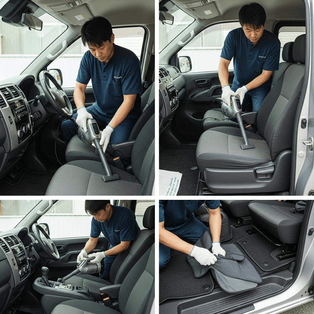 デルタバンは第一印象が査定の8割を決めます。シート隙間のゴミ除去、マット洗浄、樹脂パーツ艶出しで新車級の清潔感に。特に臭いゼロなら「禁煙車」扱いで+5~8万円UP。
