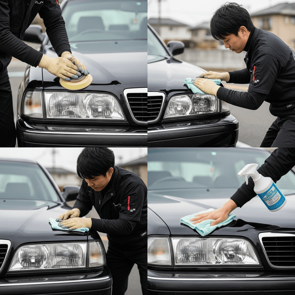 ディアマンテはヘッドライトの黄ばみとボディの鉄粉が第一印象を損ねます。研磨+鉄粉除去クリーナー+ワックスで輝きを取り戻せば「程度良好」と判断され+4~7万円の効果。