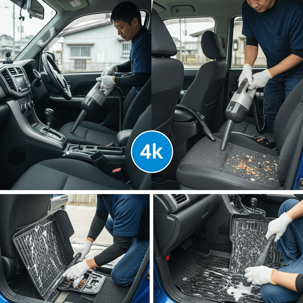 ディアスワゴンは第一印象が査定の8割を決めます。シート隙間のゴミ除去、マット洗浄、樹脂パーツ艶出しで新車級の清潔感に。特に臭いゼロなら「禁煙車」扱いで+5~8万円UP。