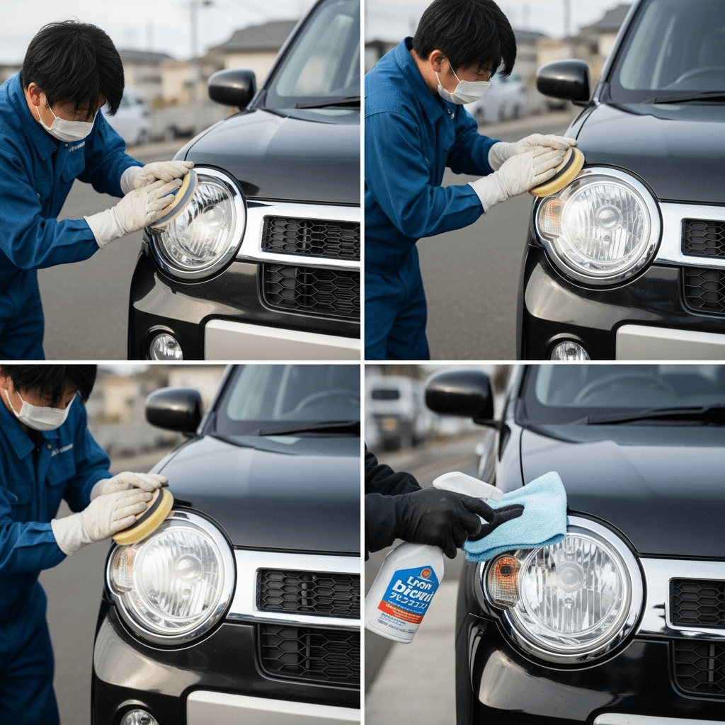 ディアスワゴンはヘッドライトの黄ばみとボディの鉄粉が第一印象を損ねます。研磨+鉄粉除去クリーナー+ワックスで輝きを取り戻せば「程度良好」と判断され+4~7万円の効果。