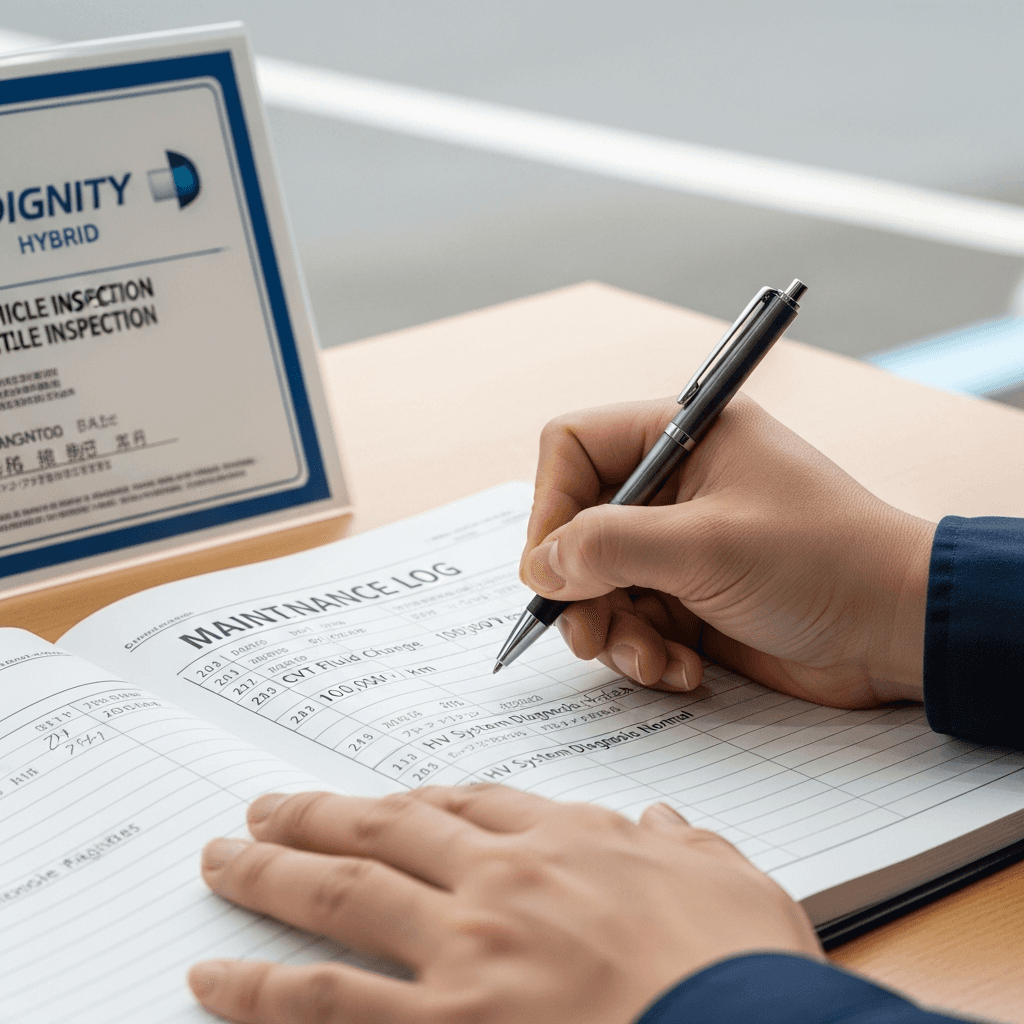 整備記録簿にCVTフルード交換やHVシステム診断の履歴を明記。特に「10万km時CVT交換済」「バッテリー冷却系点検済」の記載があれば査定士の信頼度が急上昇し、+6~10万円の価値創出が可能です。