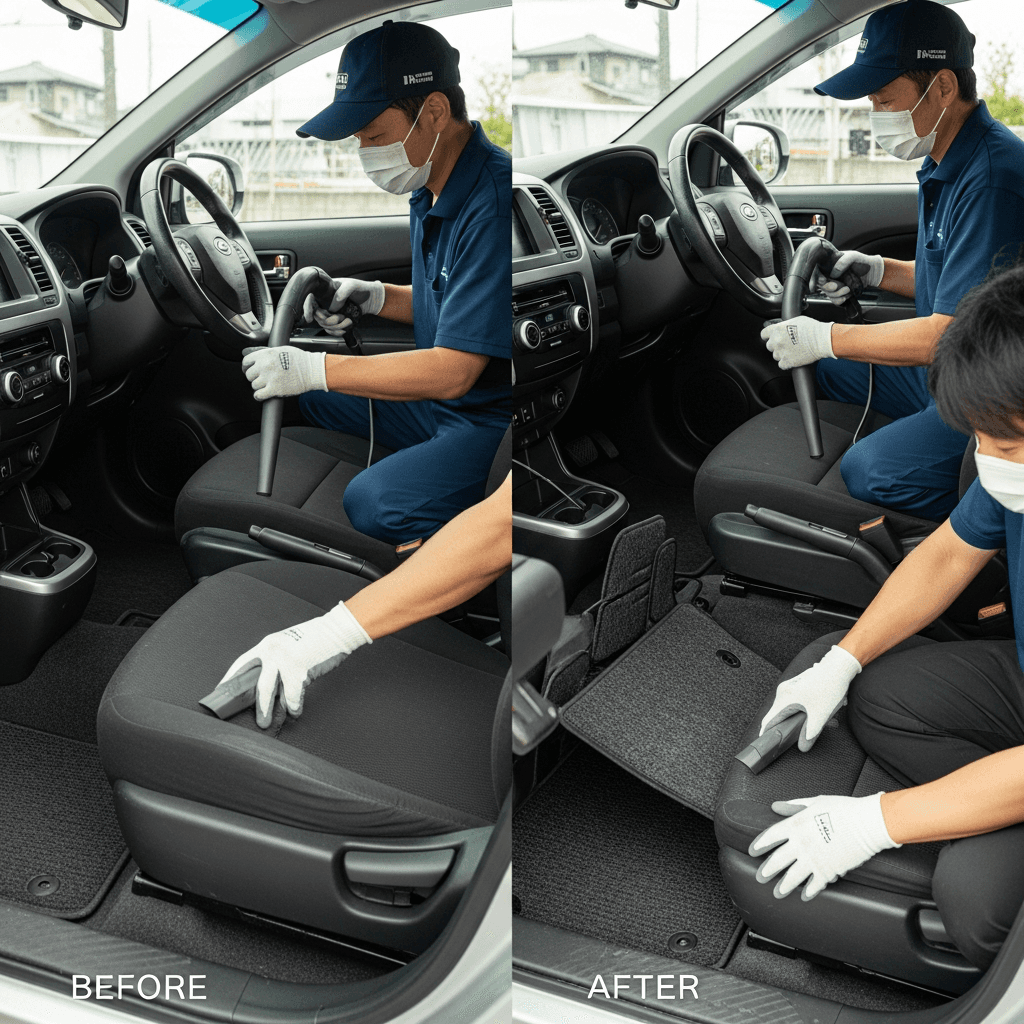 ディオンは第一印象が査定の8割を決めます。シート隙間のゴミ除去、マット洗浄、樹脂パーツ艶出しで新車級の清潔感に。特に臭いゼロなら「禁煙車」扱いで+5~8万円UP。