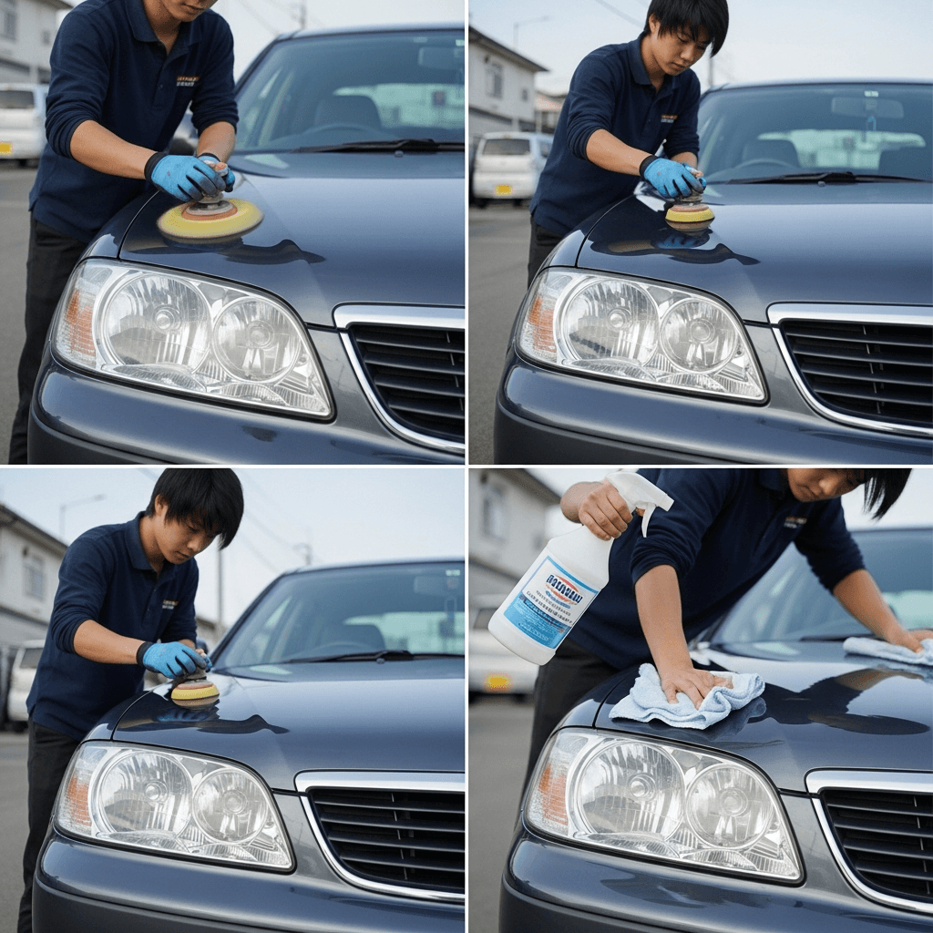 ドミンゴはヘッドライトの黄ばみとボディの鉄粉が第一印象を損ねます。研磨+鉄粉除去クリーナー+ワックスで輝きを取り戻せば「程度良好」と判断され+4~7万円の効果。