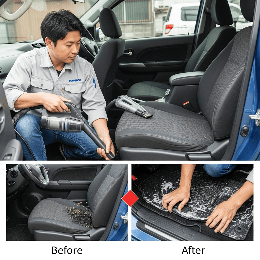 ドミンゴは第一印象が査定の8割を決めます。シート隙間のゴミ除去、マット洗浄、樹脂パーツ艶出しで新車級の清潔感に。特に臭いゼロなら「禁煙車」扱いで+5~8万円UP。