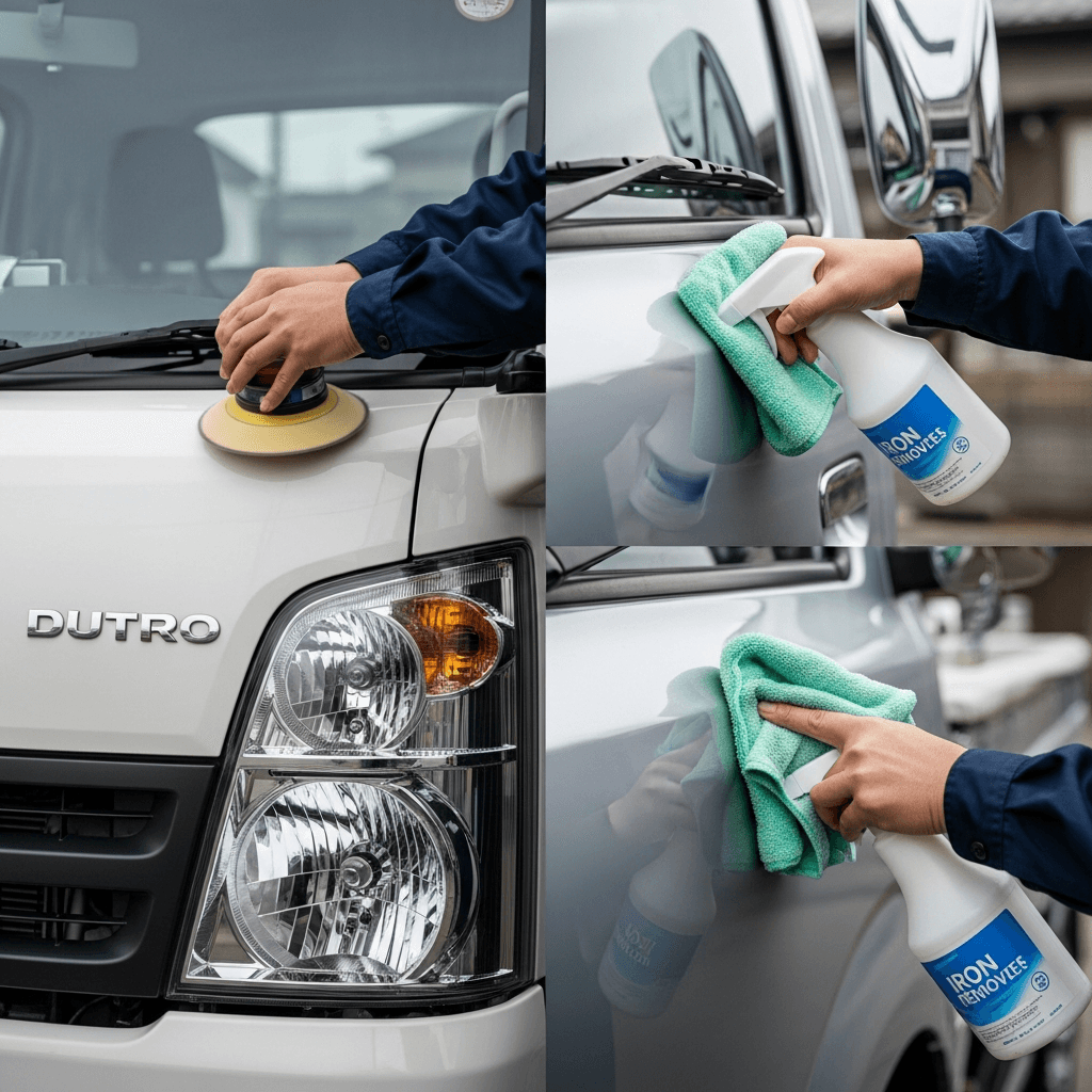 デュトロはヘッドライトの黄ばみとボディの鉄粉が第一印象を損ねます。研磨+鉄粉除去クリーナー+ワックスで輝きを取り戻せば「程度良好」と判断され+4~7万円の効果。