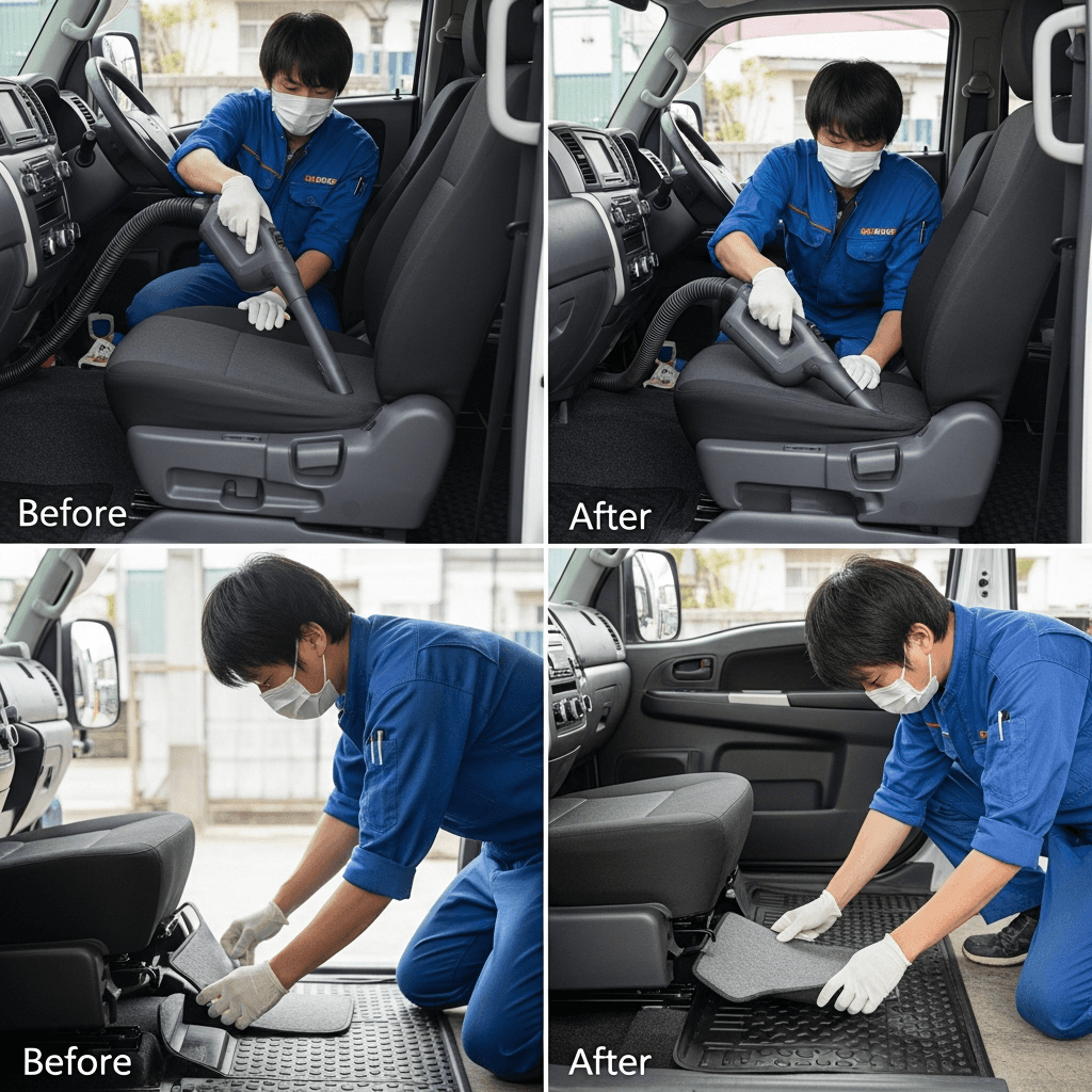 デュトロは第一印象が査定の8割を決めます。シート隙間のゴミ除去、マット洗浄、樹脂パーツ艶出しで新車級の清潔感に。特に臭いゼロなら「禁煙車」扱いで+5~8万円UP。