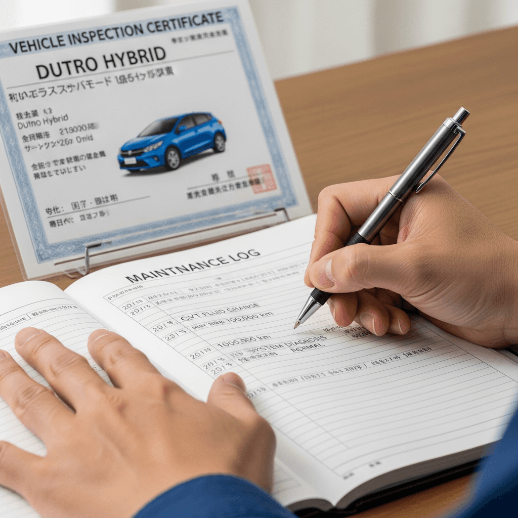 整備記録簿にCVTフルード交換やHVシステム診断の履歴を明記。特に「10万km時CVT交換済」「バッテリー冷却系点検済」の記載があれば査定士の信頼度が急上昇し、+6~10万円の価値創出が可能です。