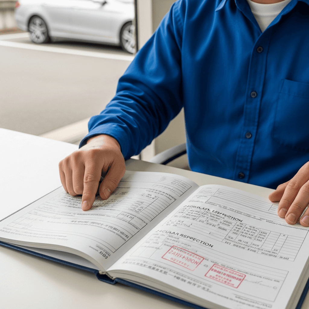 Eクラスの整備記録簿に定期点検(12ヶ月・24ヶ月)の履歴が全て記載されていれば「管理の行き届いた車」と高評価。特にエンジンオイル交換履歴は重要で+6~9万円の効果。