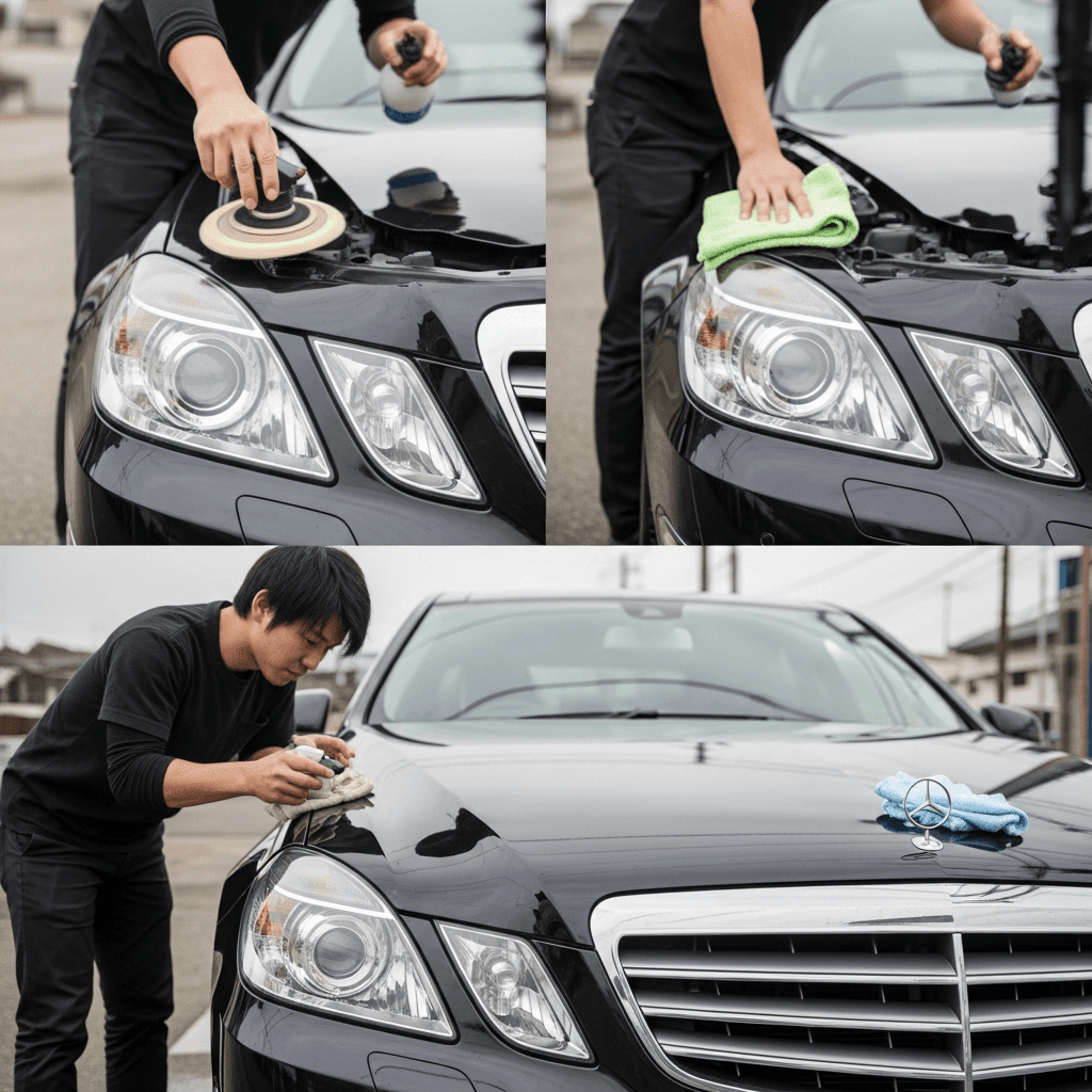 Eクラスはヘッドライトの黄ばみとボディの鉄粉が第一印象を損ねます。研磨+鉄粉除去クリーナー+ワックスで輝きを取り戻せば「程度良好」と判断され+4~7万円の効果。