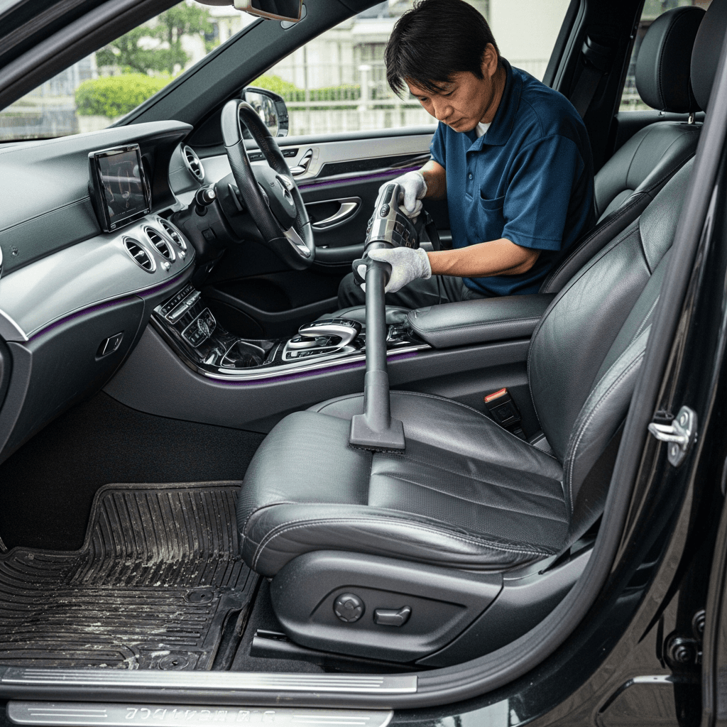 Eクラスは第一印象が査定の8割を決めます。シート隙間のゴミ除去、マット洗浄、樹脂パーツ艶出しで新車級の清潔感に。特に臭いゼロなら「禁煙車」扱いで+5~8万円UP。