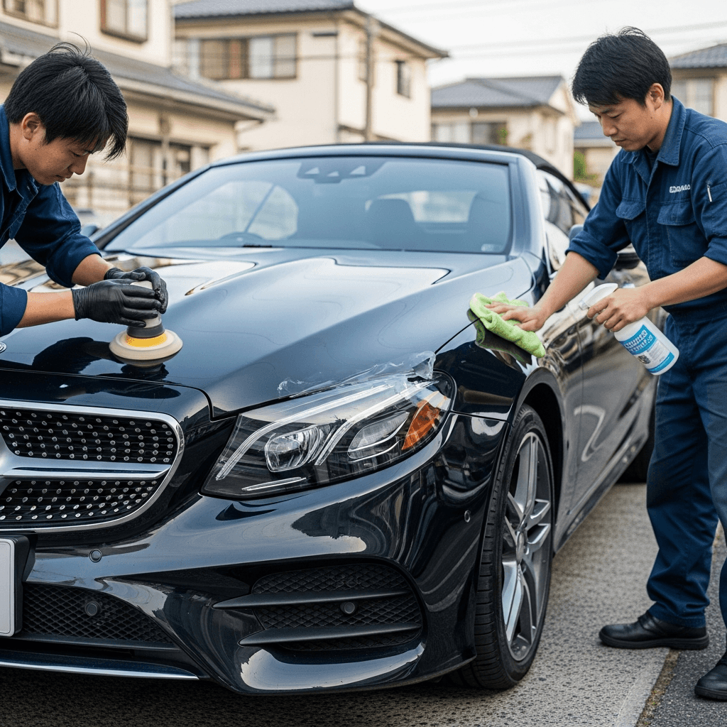 Eクラスカブリオレはヘッドライトの黄ばみとボディの鉄粉が第一印象を損ねます。研磨+鉄粉除去クリーナー+ワックスで輝きを取り戻せば「程度良好」と判断され+4~7万円の効果。