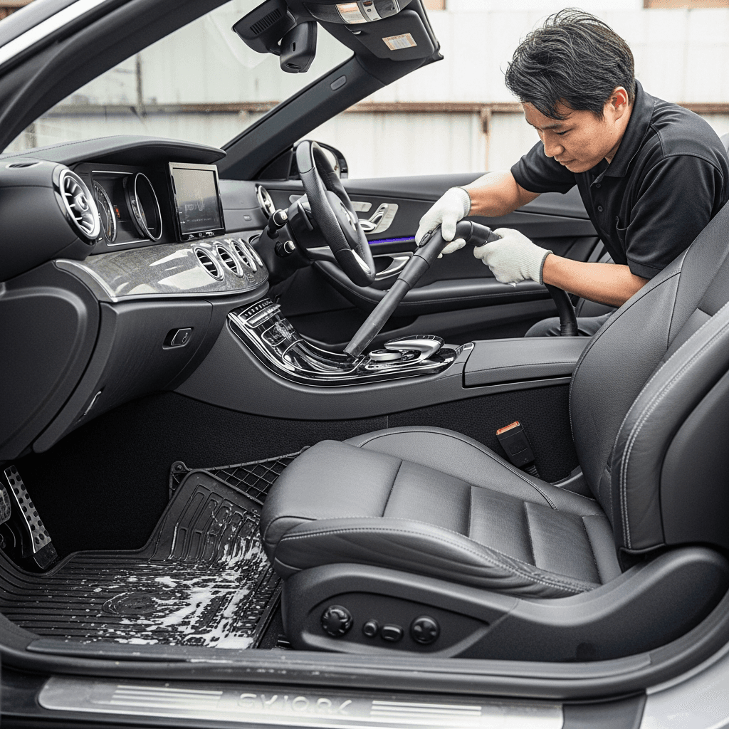 Eクラスカブリオレは第一印象が査定の8割を決めます。シート隙間のゴミ除去、マット洗浄、樹脂パーツ艶出しで新車級の清潔感に。特に臭いゼロなら「禁煙車」扱いで+5~8万円UP。