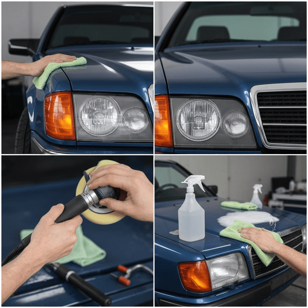 Eクラスクーペはヘッドライトの黄ばみとボディの鉄粉が第一印象を損ねます。研磨+鉄粉除去クリーナー+ワックスで輝きを取り戻せば「程度良好」と判断され+4~7万円の効果。