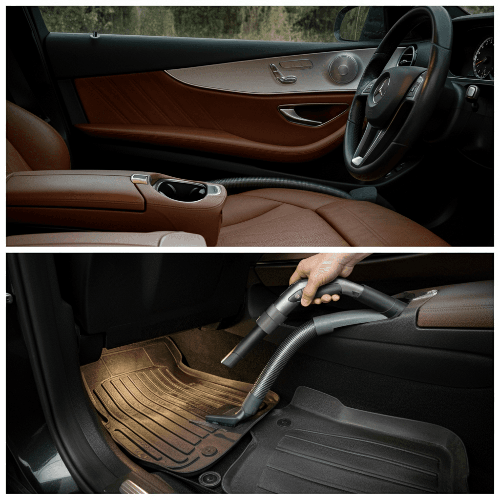 Eクラスワゴンは第一印象が査定の8割を決めます。シート隙間のゴミ除去、マット洗浄、樹脂パーツ艶出しで新車級の清潔感に。特に臭いゼロなら「禁煙車」扱いで+5~8万円UP。