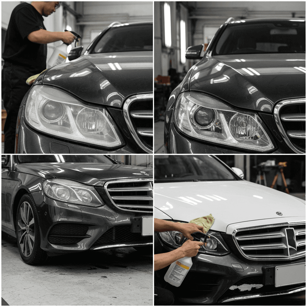 Eクラスワゴンはヘッドライトの黄ばみとボディの鉄粉が第一印象を損ねます。研磨+鉄粉除去クリーナー+ワックスで輝きを取り戻せば「程度良好」と判断され+4~7万円の効果。
