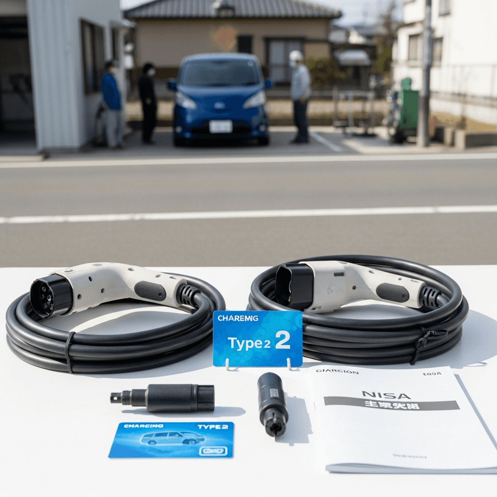 EV車の査定は充電環境が全て。e-NV200バンの純正充電ケーブル(普通・急速)、充電カード(会員証)、アダプター類を全て揃えて撮影。「すぐ使える」安心感で+6~10万円UPが期待できます。