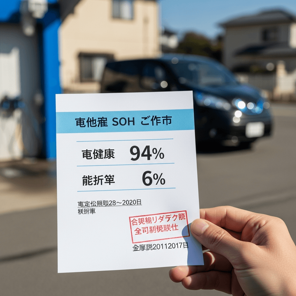 EVの最大不安はバッテリー劣化。ディーラーでSOH(バッテリー健全性)診断を受け、「90%以上」の証明書があれば査定額が劇的にUP。診断費用5,000円で+12~20万円のリターンが期待できます。