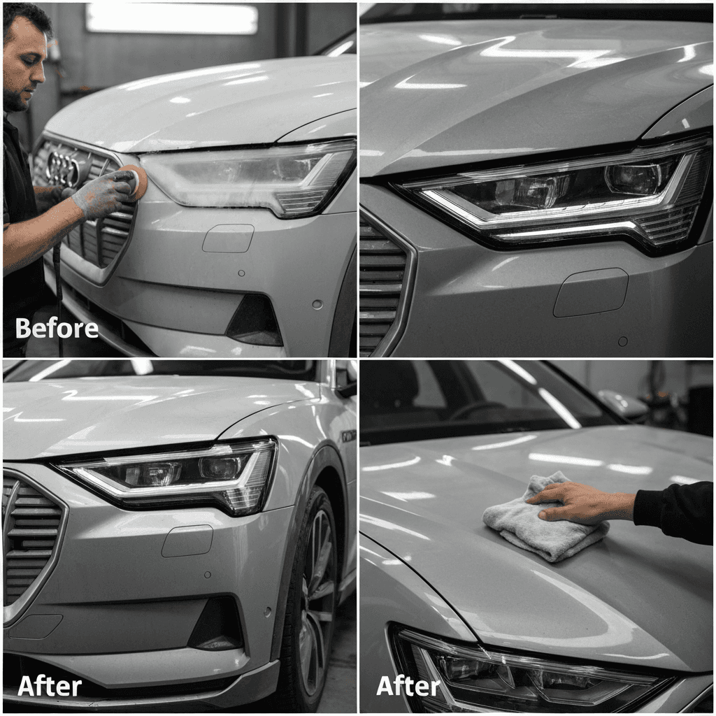 e-tronはヘッドライトの黄ばみとボディの鉄粉が第一印象を損ねます。研磨+鉄粉除去クリーナー+ワックスで輝きを取り戻せば「程度良好」と判断され+4~7万円の効果。