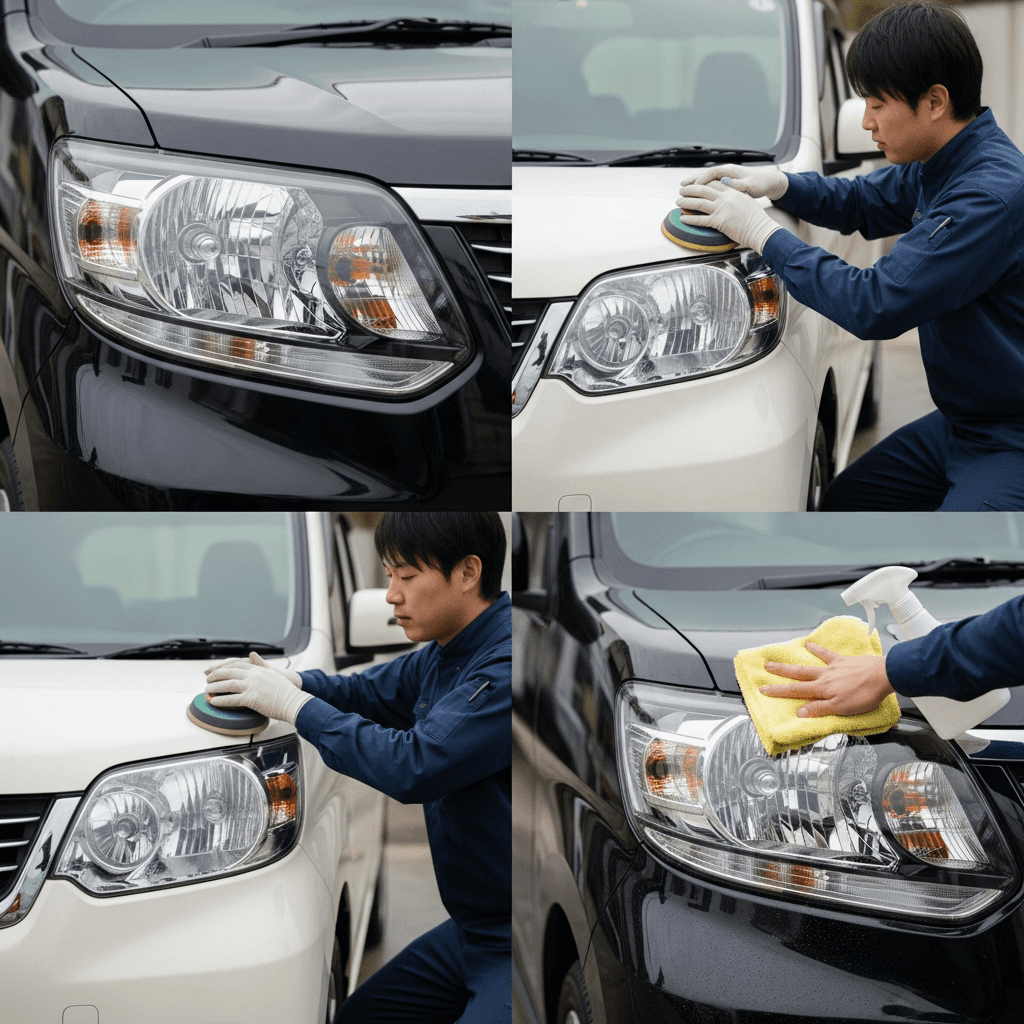 eKカスタムはヘッドライトの黄ばみとボディの鉄粉が第一印象を損ねます。研磨+鉄粉除去クリーナー+ワックスで輝きを取り戻せば「程度良好」と判断され+4~7万円の効果。