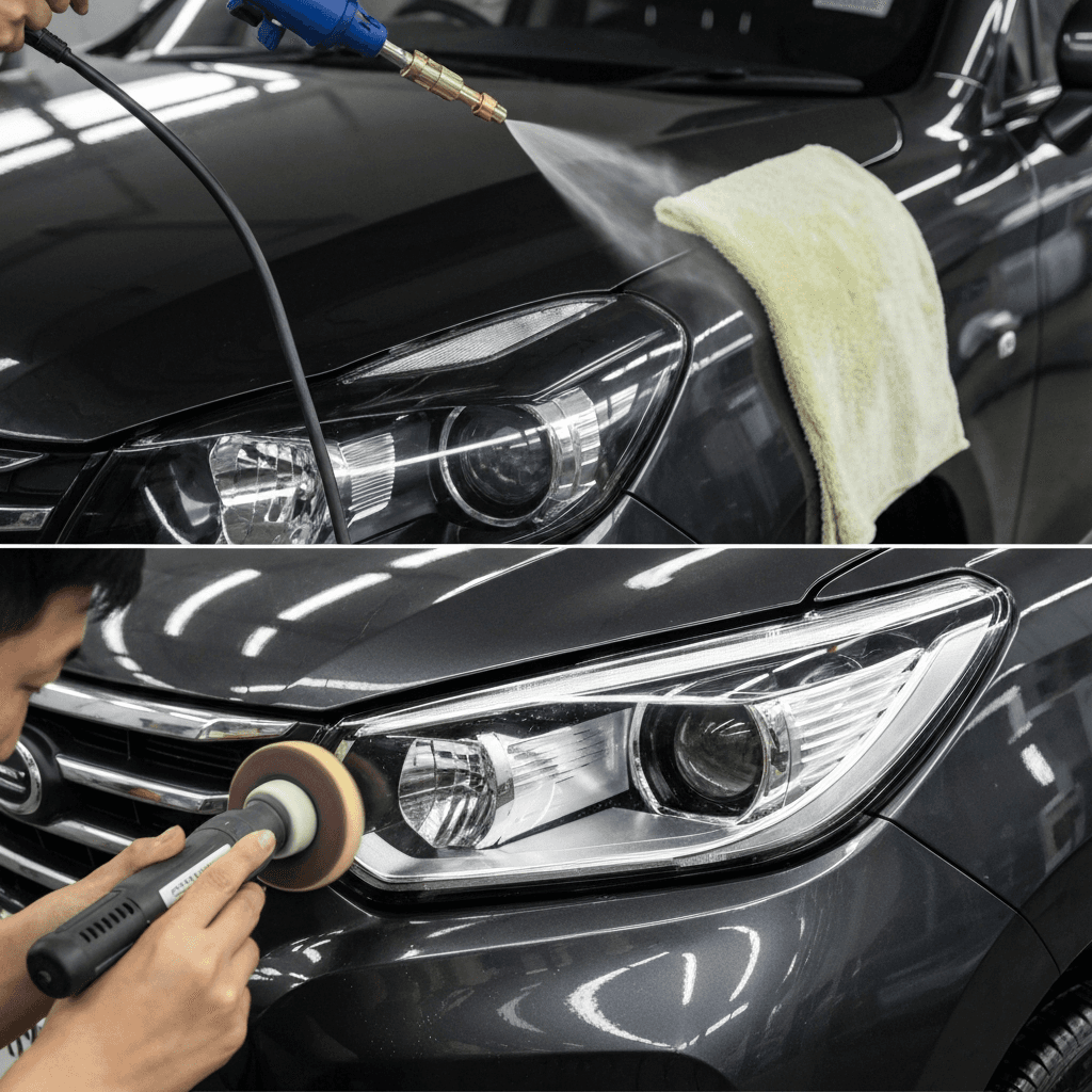 ヘッドライト黄ばみ除去+ボディ鉄粉除去で輝き復活!